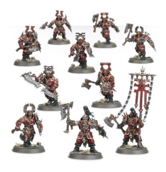 This multi-part plastic kit gives you everything necessary to build ten Blood Warriors. You’ll get some impressive customisation options - each can be armed with either a Goreaxe and Gorefist or two Goreaxes. One model can be built as Chaos Champion with a special, even more intimidating axe; this really is a kit for the axe-inclined among you! One model can be upgraded with a special weapon, the Goreglaive, and one can be built as an Icon Bearer. Includes ten Citadel 32mm Round Bases.