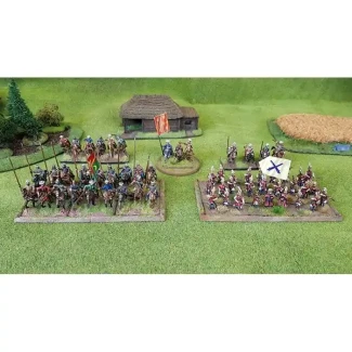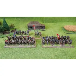 All units in this set have bases, movement trays and - when required - also spears/pikes and banners. Miniatures are made of thermoplastic, horses are made of plastic. All miniatures require gluing and are unpainted. Contents may vary from picture shown.