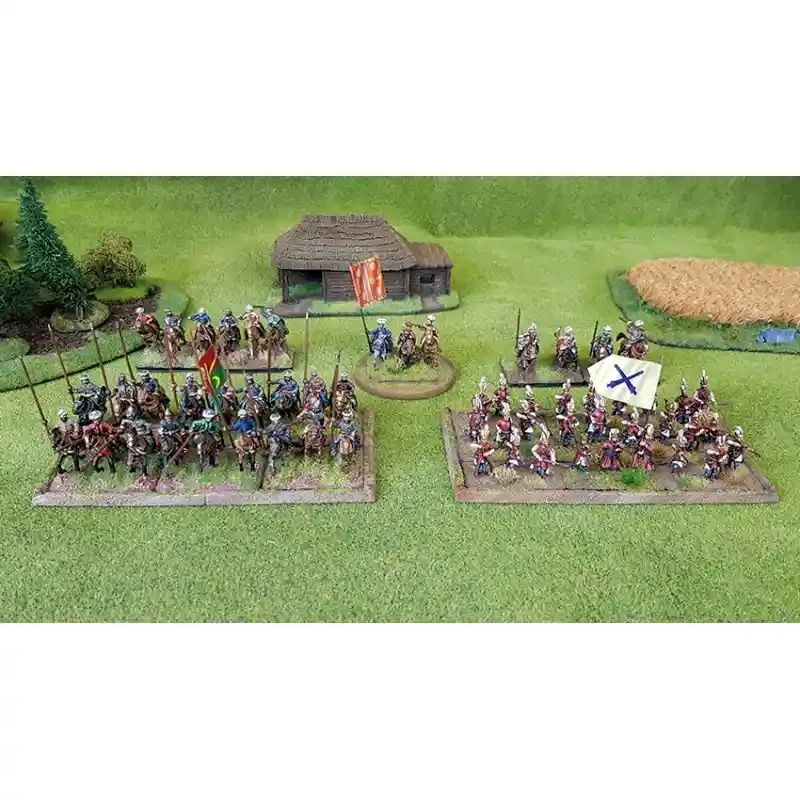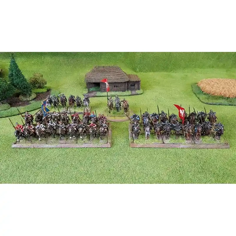 The forces of the Polish-Lithuanian Commonwealth are strengthened by Units of PANCERNI WITH SPEARS and COSSACK STYLE CAVALRY WITH SPEARS, who greatly increase the offensive capabilities of the army. You also receive 2 additional bases of PANCERNI, which allow you to expand your Unit from the 2-Player Starter Set from size S to size M. A ROTAMASTER assists in commanding the significantly expanded forces. Thus strengthened, the Army of the Polish-Lithuanian Commonwealth is ready to fi ght any enemy that decides to cross the country's border.