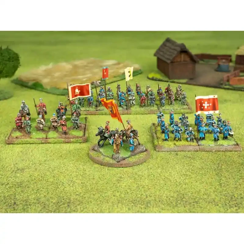 All units in this set have bases, movement trays and - when required - also spears/pikes and banners. Miniatures are made of metal, horses are made of plastic. All miniatures require gluing and are unpainted. Contents may vary from picture shown.