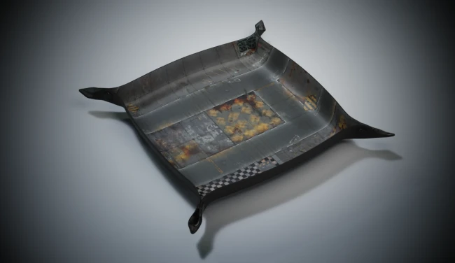 Dice tray from mousepad material (neoprene) with plastic snaps in the corners to get it ready in seconds (can be stransported flat, rolled or folded)