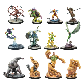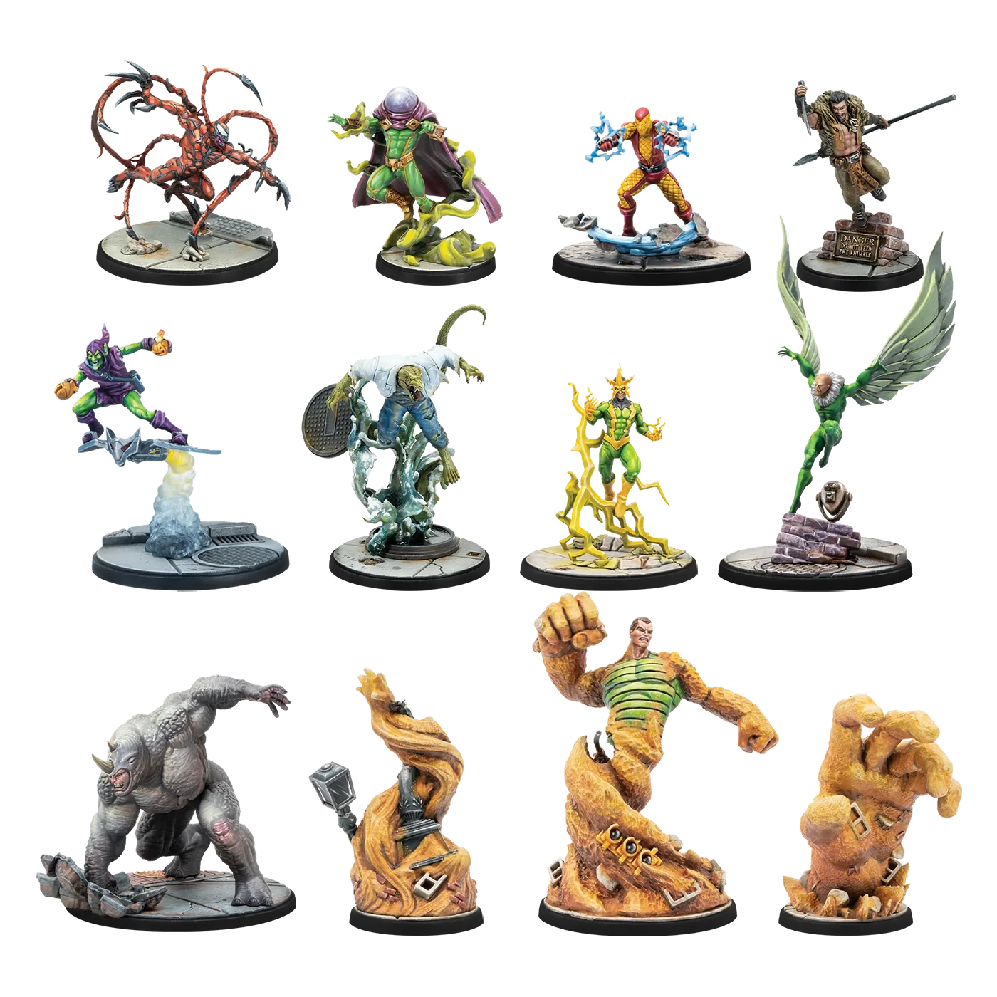 A full roster of some of Spider-Man’s most iconic villains are set to send a jolt to the Spidey-Senses as they take to the streets of New York with one goal in mind: swat down the spider! This Starter Set contains all the miniatures, Character Stat Cards, and Team Tactic Cards for the following characters: Green Goblin, Kraven the Hunter, the Lizard, Mysterio, Shocker, Sandman, Carnage, Rhino, Vulture, and Electro. Also includes Crisis Cards and all the tokens, measuring tools, and dice needed to play. Players interested in getting into Marvel: Crisis Protocol will find that Starter Sets are