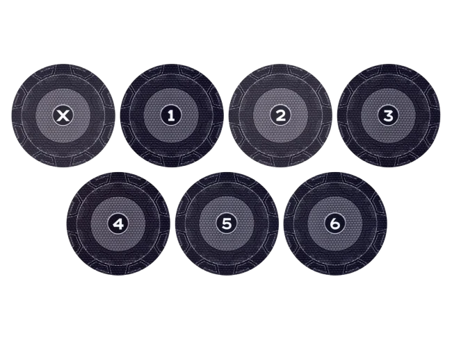 Clearly define the 3-inch scoring zone in your Warhammer 40,000 games. This complete set of 7 non-slip 'mousepad' material objective markers (numbered 1-6 & X) eliminates arguments and speeds up play.