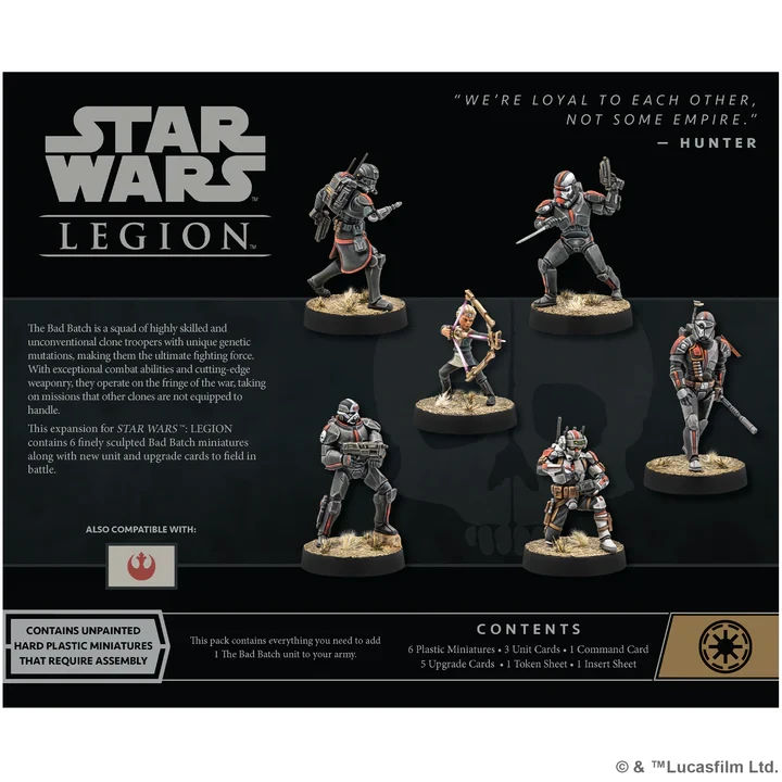The infamous Bad Batch comes to Star Wars™: Legion in this new pack! Also known as Clone Force 99, the members of the Batch all possess genetic mutations or other enhancements that make them stand out from the Republic's other clone troopers and forges them into a unique fighting unit. This pack brings six new miniatures to Star Wars: Legion, including Clone Sergeant Hunter, Wrecker, Tech, Echo, Crosshair, and Omega. These miniatures are accompanied by two Unit Cards that allow players to field the Bad Batch in their Galactic Republic armies or as a Mercenary Unit usable by the Rebel Alliance. Rounding out the pack are 3 new Command Cards that make use of the Bad Batch's unique characteristics and 4 Upgrade Cards that invite players to customize the Batch to fit their strategies.