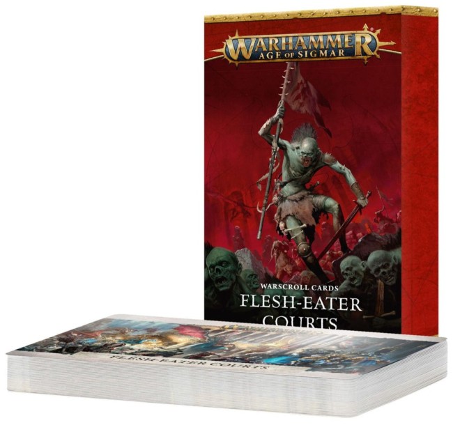 This set of 40 cards will help you keep track of your Flesh-eater Courts armies in games of Warhammer Age of Sigmar. There are individual warscroll cards for each unit, manifestation, and faction terrain piece detailing their profiles, wargear, options, and special abilities.