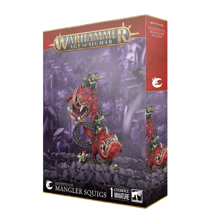 This multipart plastic kit builds one set of Mangler Squigs – a conjoined flail of fanged death. These massive monsters are a dynamic collection of drooling jaws and tangled ball-and-chains, with grot riders clinging on for dear life. This kit is packed with options for customising your Mangler Squigs – each squig comes with multiple head options and an optional faceplate, as well as a choice of rider builds and whirling chains that allow you to position your bouncing beasts differently. You'll also find basing accessories like nasty fungus and fleeing, falling grotlings.