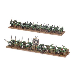 This multipart plastic kit builds 40 Goblins, cackling mobs that gather amongst the Orc & Goblin Tribes. Each Goblin can be armed with either a thrusting spear and a crude shield, or a shortbow and quiver of arrows. This kit also provides all the command upgrades you'll need, whether you field your Goblins in small groups or one massive mob – you can build musicians, champions, and standard bearers with a choice of banners.